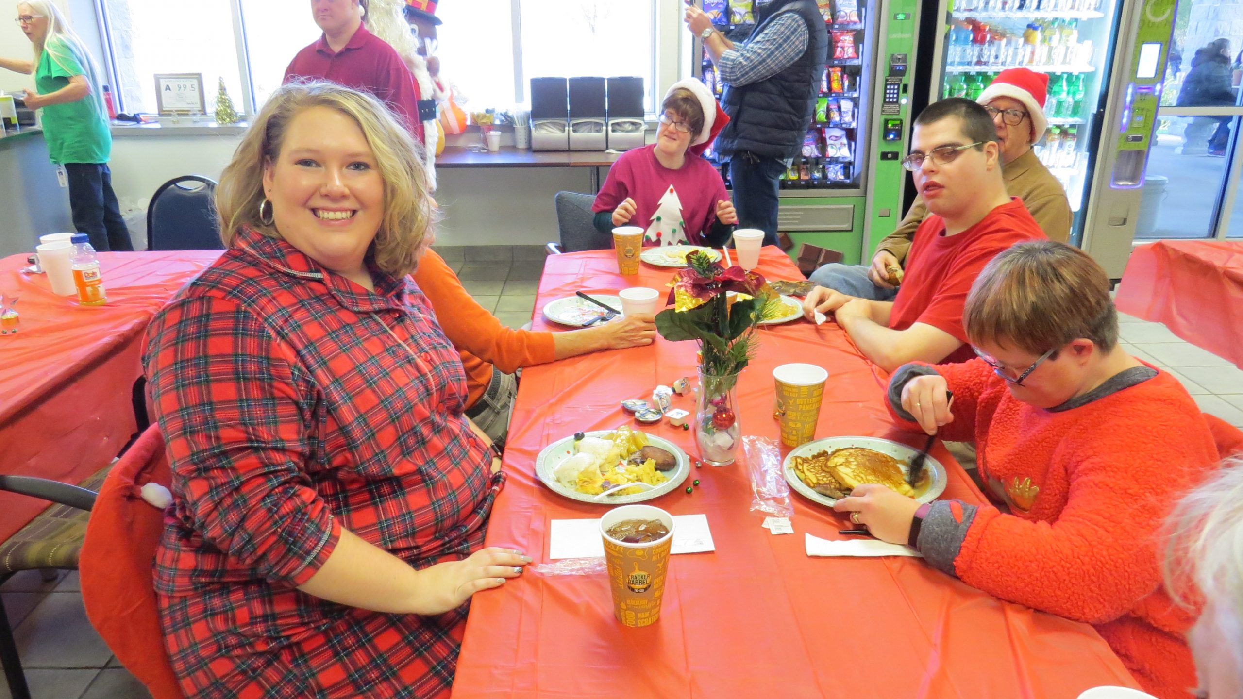 Thanksmas brunch was catered by the Cracker Barrel and included pancakes, bacon, and biscuits and gravy. All shifts TVS employees and program participants were invited to the brunch and the TVS Leadership team served the meal.