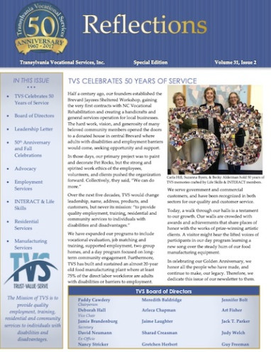 Celebrating 50 years of service This newsletter showcases a year of celebration including a company picnic, fun holiday cheer, and a move into grassroots advocacy as TVS hits a half century milestone. Inside the newsletter is full of new Programs and Services Team Leaders along with new Government…